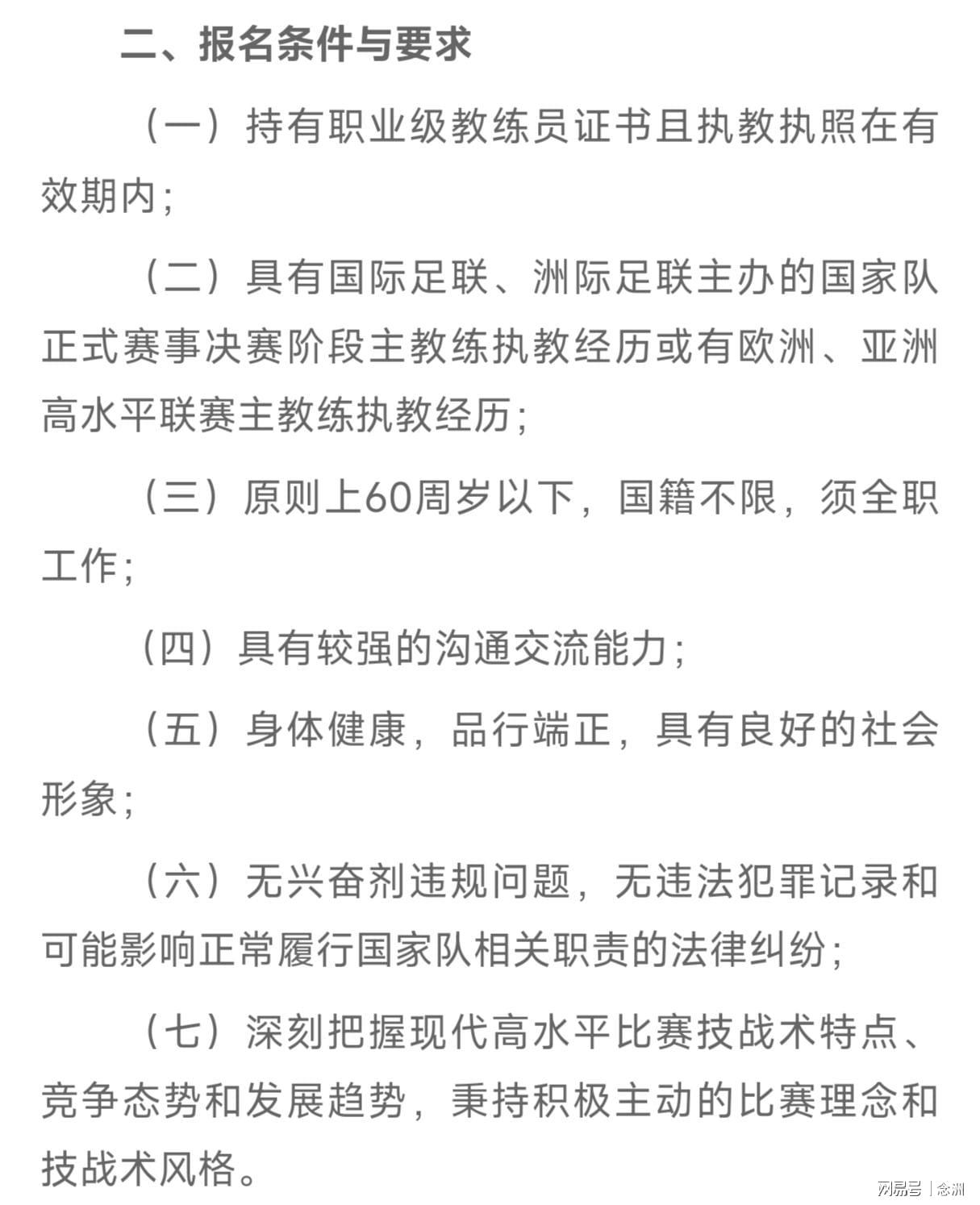 招聘条件有7个:第一,持有职业级教练员证书且执教执照在有效期内;第二,具有国际足联、洲际足联主办的国家队正式赛事决赛阶段主教练执教经历或有欧洲、亚洲高水平联赛主教练执教经历;