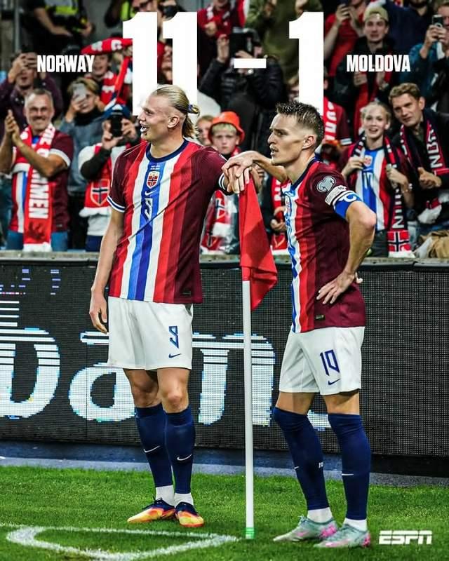 世预赛欧洲区小组赛I组第6轮,挪威队坐镇主场优势火力全开,哈兰德攻入5球且送出2次助攻,奥斯高打进4球,米勒、厄德高各进一球,最终11-1狂胜摩尔多瓦队,积15分继续领跑积分榜,同时多赛一轮甩开意大利队6分。